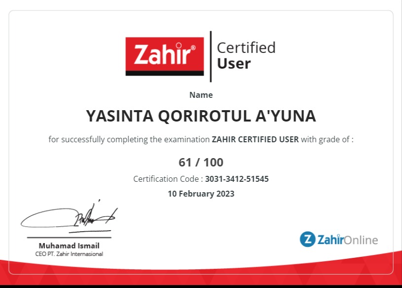 Certificate for User Yasinta Qorirotul A’yuna